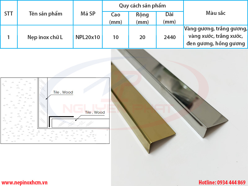 Bảng thông số chi tiết nẹp inox chữ L20x10mm
